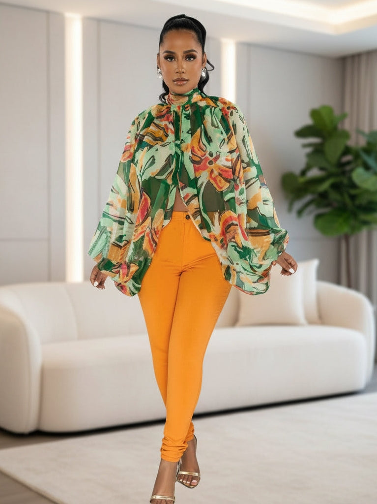 Soft, breathable and beautifully detailed, this Chiffon Lace-Up Batwing Sleeve Top brings an effortless touch of glam to your everyday style. The flowing batwing sleeves create a relaxed, airy silhouette, while the lace-up neckline adds a chic, feminine finish. Lightweight printed chiffon makes it perfect for warm days, layered looks or elevated casual outfits.
